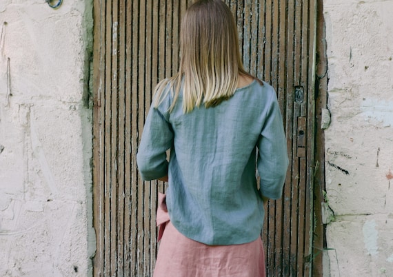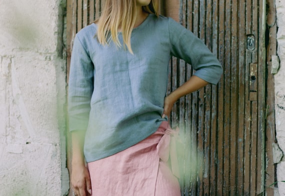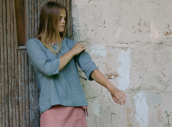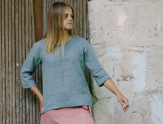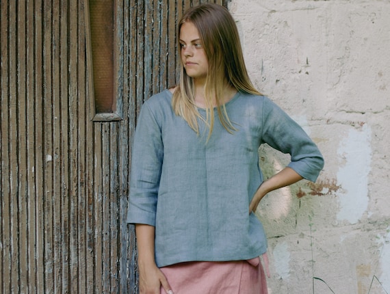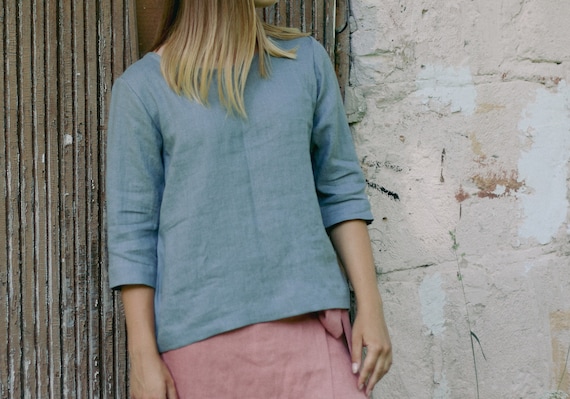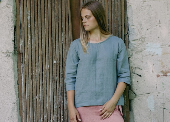 Linen blouse KEITA – linen blouse with 3/4 sleeves features boat neck and has loose relaxed fit. All seasons blouse perfect for work or as casual everyday wear. FABRIC: 100% pre-washed softened linen, 205 g/m2, 6 oz/yd2 OEKO-TEX standards certified linen The length of this top is around 24.4 inches (62 cm). Model is wearing S size in color – Asphalt. The model is 5’6”/169 cm – bust 34.2in/87cm, waist 28.3in/72cm, hips 37in/94cm. Model usually wears S or M size. Size chart and color options can be found in last listed pictures. Please choose color and size from the side menu. *actual color may vary from picture due to monitor settings CARE: Washing machine – at 40C degrees, hang dry recommended. Ironing is optional, linen natural characteristics are slightly creased. KindlyLinen products are made with dedication and attention to details in Latvia, EU. Thank you for visiting our shop kindlyLinen! https://www.etsy.com/shop/kindlyLinen Please contact us if you have any questions. We are here to help in any way we can. *we do accept the wholesale inquires.