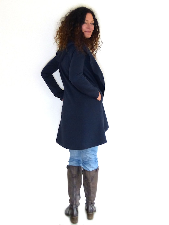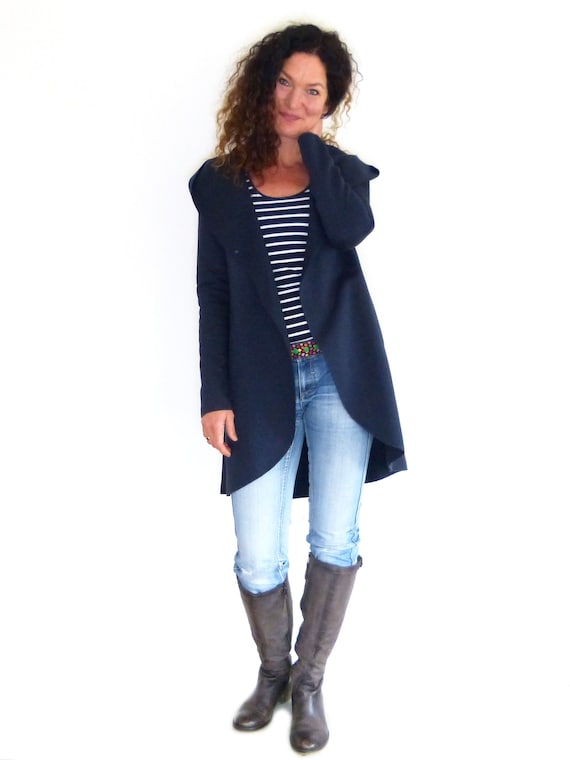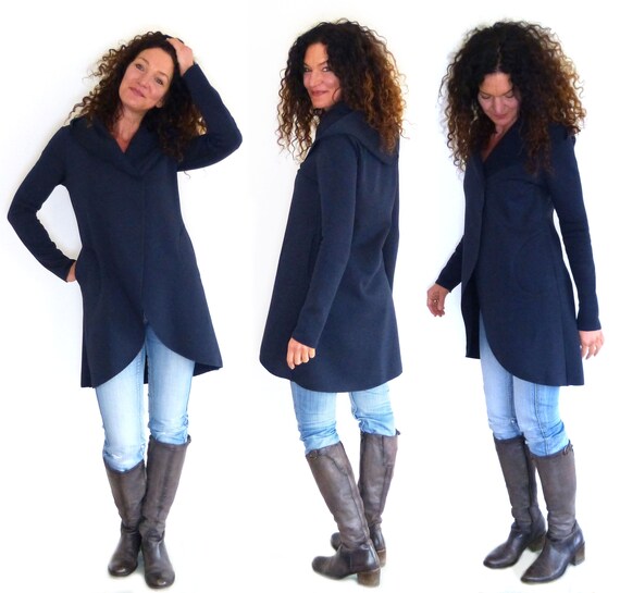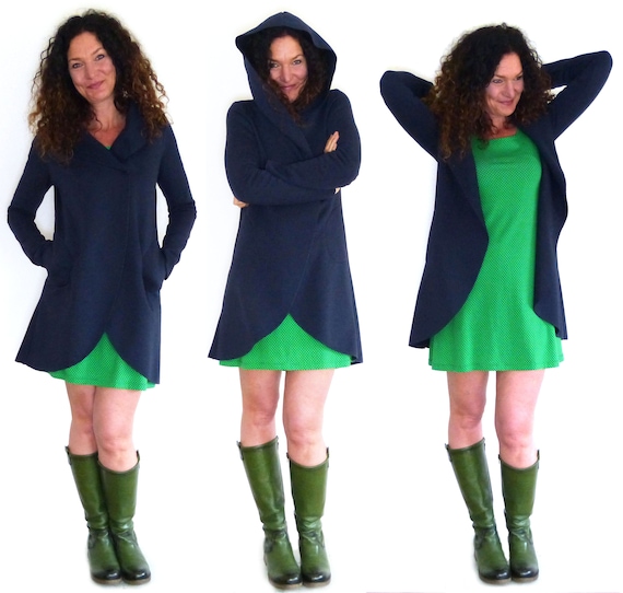 Delivery times, including transport, until the goods arrive at you: within Germany: 5-7 days from payment EU-Foreign: 10-12 days from payment Switzerland: 5-7 days from payment USA and Canada: 14-16 days from payment Other countries: 20-22 days from payment Our model Marylin in marine A really nice hooded coat with 2 pockets. Great for the transition period or even in winter as an underjacket. Made of high-quality, thick sweat, which is heavily fluffy roughened inside. With a wraparound roller hem and a great scarf collar, which you can wear super open or close with 1 small push button. The scarf collar falls very nicely if you don’t wear the hood and ends up in round sides that fit perfectly to the sita dresses, but also to trousers and skirt. A must-have – a lot of joy with it! The pictured dress can be found in the shop at: https://de.dawanda.com/product/98771471-kleid-a-form-gruen-mit-punkten-in-marine **Type of production** sewn, all around with roller hem **Materials used** 80% cotton 20% polyester The model is 1.73 m tall, size 38 and wears the coat in size M. **Size/Dimensions/Weight** S (34/36) M (38/40) L (42/44)