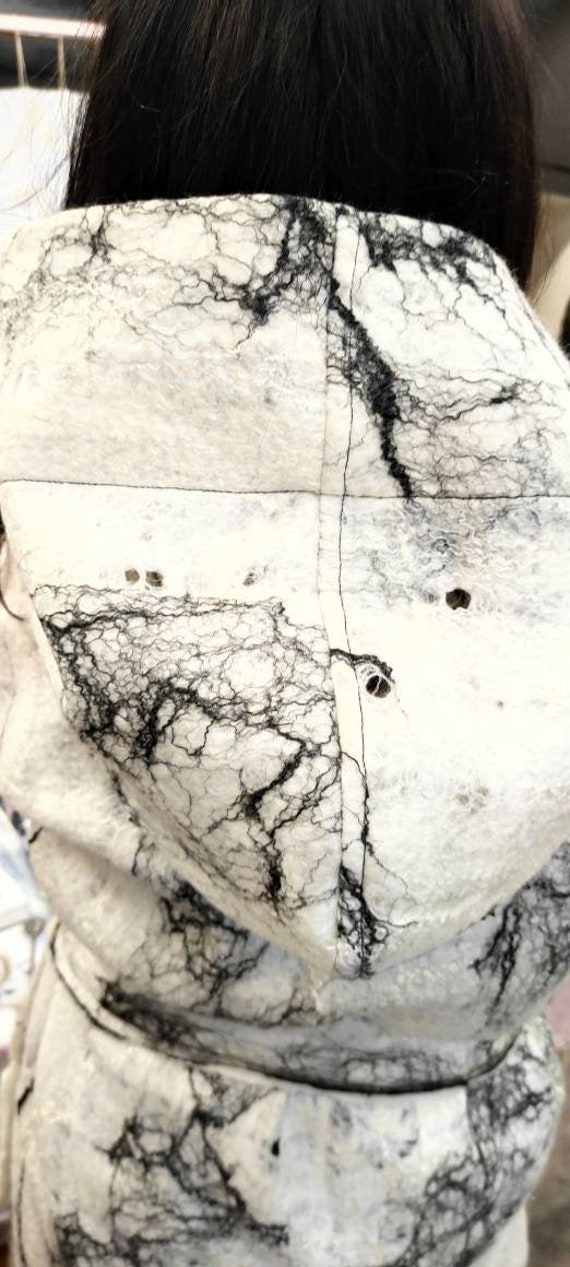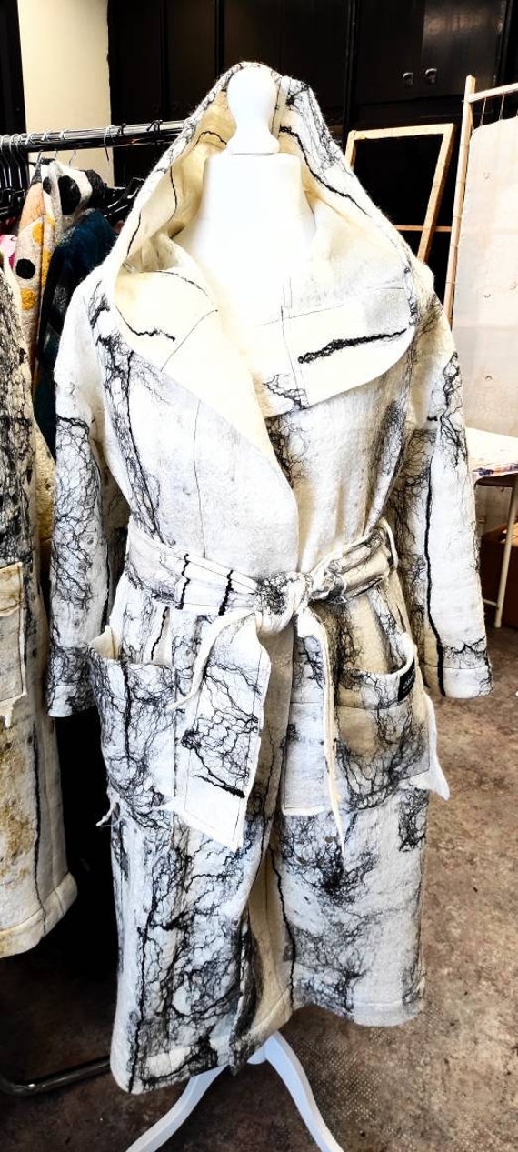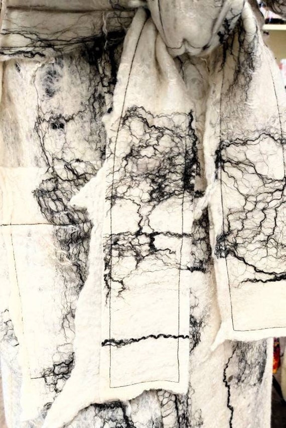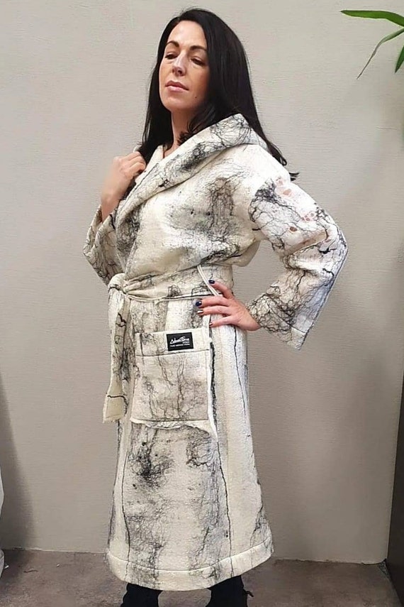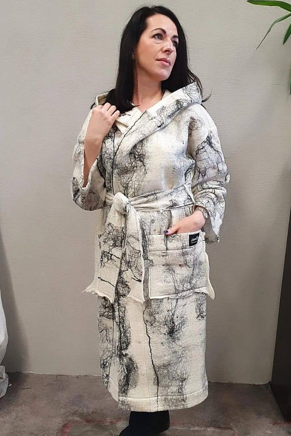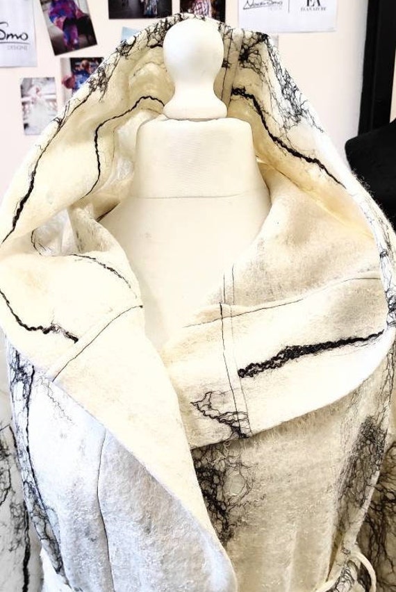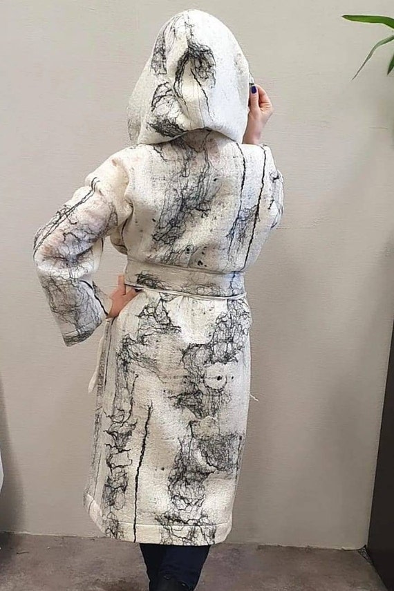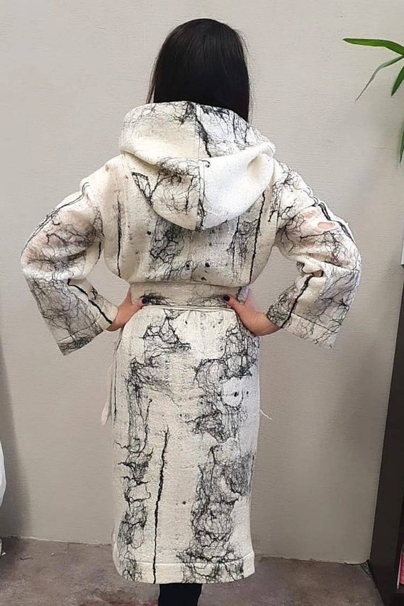 White wool coat , long white coat , oversize cardigan , wool robe , black , white and black wool felt coat Materials : Natural Australian merino wool Silk Viscose Due to a wraparound , you can fasten the coat with decorative brooches or girdle with a strap . You can take this coat with you in your travels . It does not take up much space in the luggage , it is lightweight and practically does not crumple . The coat will warm you in cool weather , protects from a wind , and in case of rain , it will dry out quickly . Bust – 115cm -120 cm Coat length – 110 cm Full sleeve length – 57cm This amazing coat is recommended for women over 165 – 170 cm tall . Hand wash . If you prefer to hand wash your garment , you can still do it . Make sure to use not to cold or not to hot water and neutral soap . Do not agitate the garment while in the water . Do not spin or wring . Flat dry reshaping the garment to its original shape .