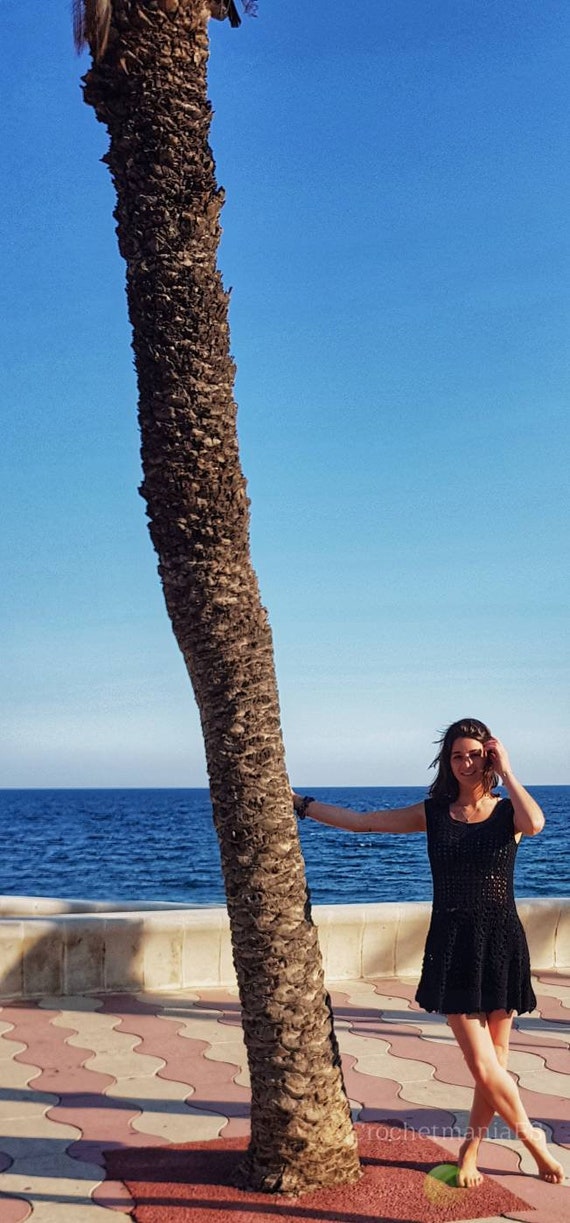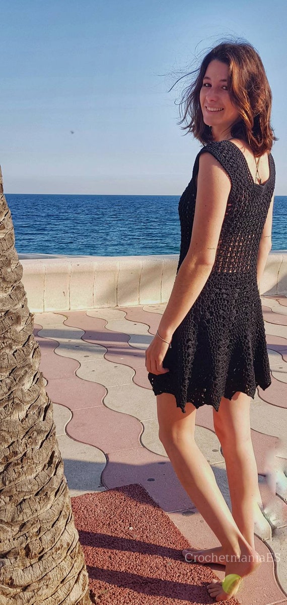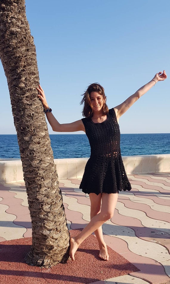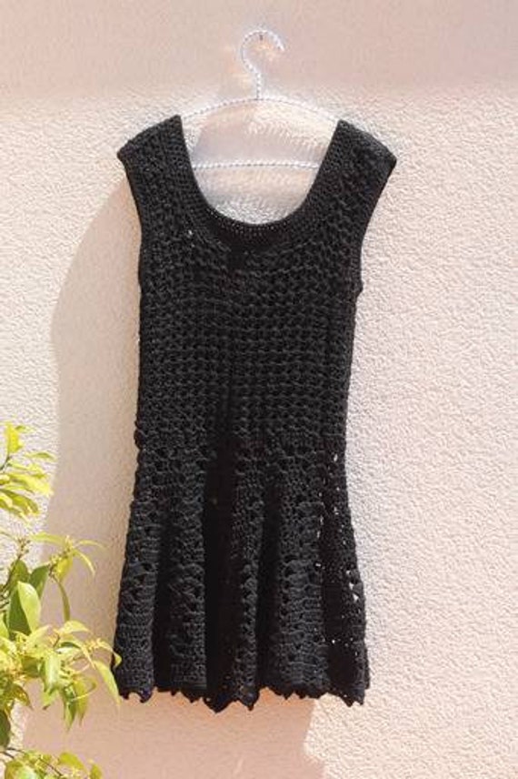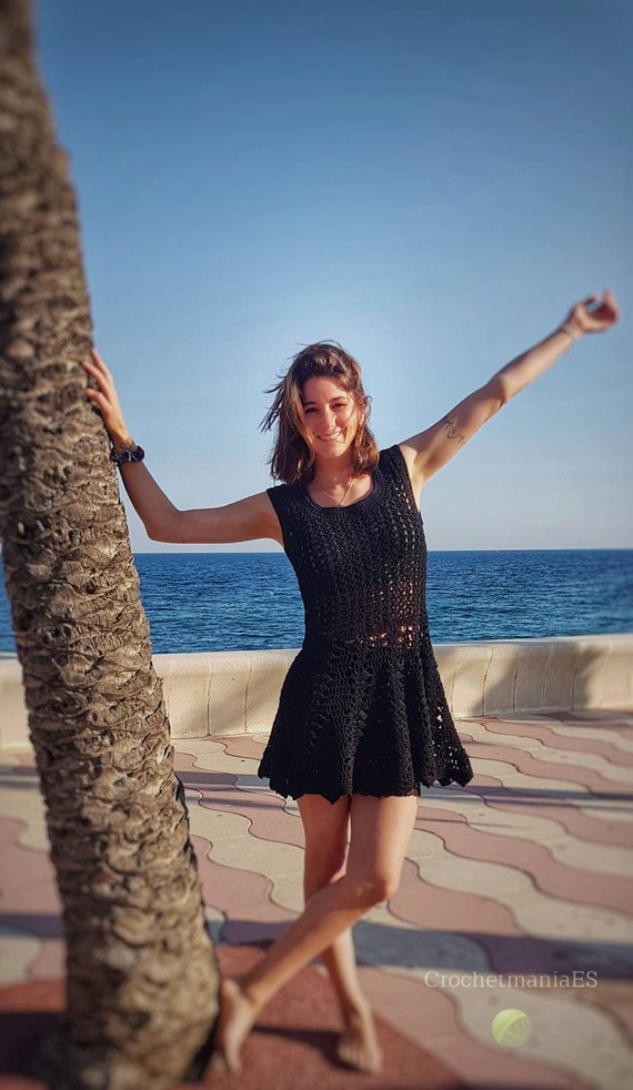 Little black dress crochet, handmade crochet black dress, short black dress crochet, mini dress black crochet, summer dress black crochet. 100% Eco cotton, recycled cotton. Size: S to small M Other sizes can be made to order and can take up to 6 weeks before shipping. Other models available in shop: https://www.etsy.com/uk/listing/1012494015/little-black-dress-crochet-black-dress https://www.etsy.com/uk/listing/962917899/blue-and-purple-crochet-dress-handmade Wash at 30° Pattern: Annoo Crochet