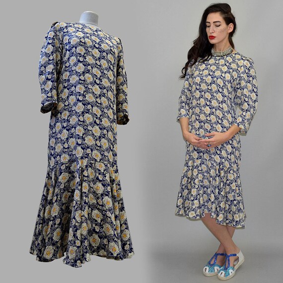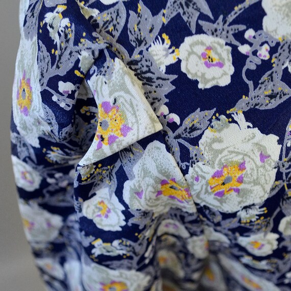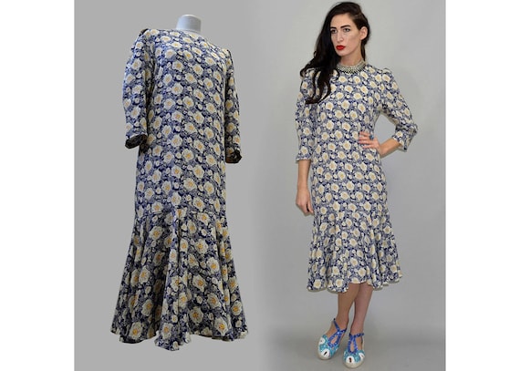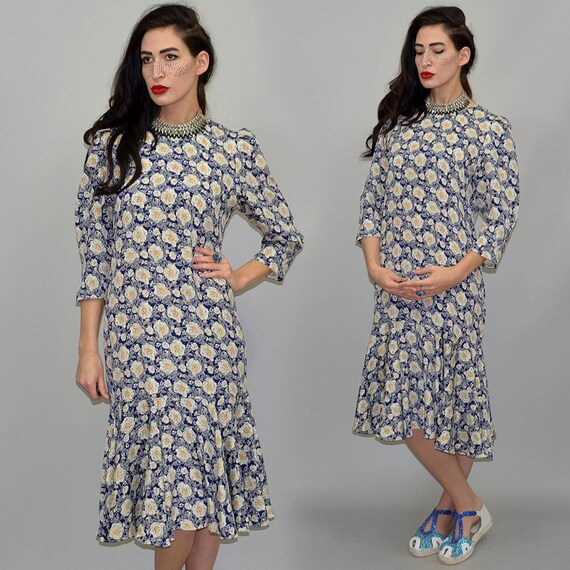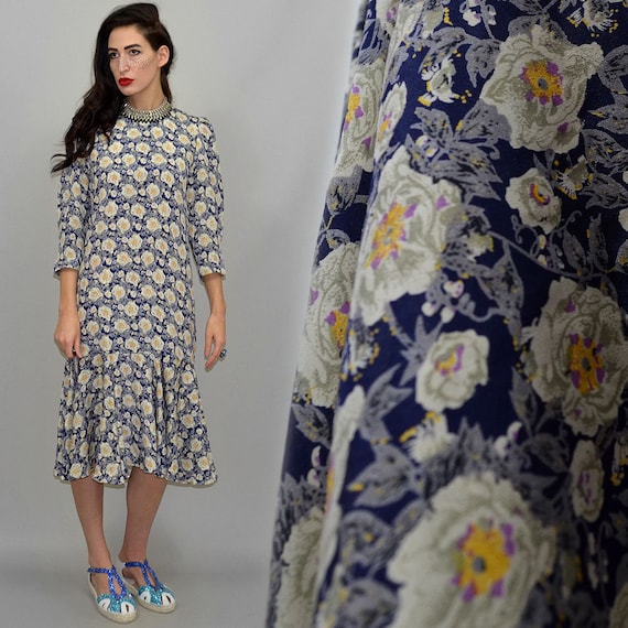 JAHRZEHNT: 1980er MATERIAL: 100% Polyester DETAILS: märchenhaft bedrucktes und minimalistisch geschnittenes Kleid mit ausgestellter Wirbel-Peplum-Volant-Rüsche am Saum; Blumen-Ranken-Muster auf mitternachtsblauem Grund; gefalzte Puffärmel; verdeckter Reißverschluss hinten ZUSTAND: sehr gut LABEL: Luci Sellini | LA Milan NY GRÖßE: entspricht schätzungsweise Gr. M (40) MAßE Länge: 120 cm ~ 47.2” Ärmel: 50 cm ~ 19.7” Achsel-Achsel: 50 cm ~ 19.7” Hüfte x2: 52 cm ~ 20.5” Alle anderen Kleidungsstücke und Accessoires, die auf den Bildern als Serviervorschlag gestylt wurden, sind nicht Bestandteil dieser Offerte.