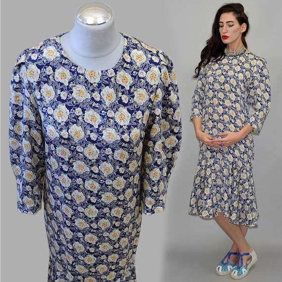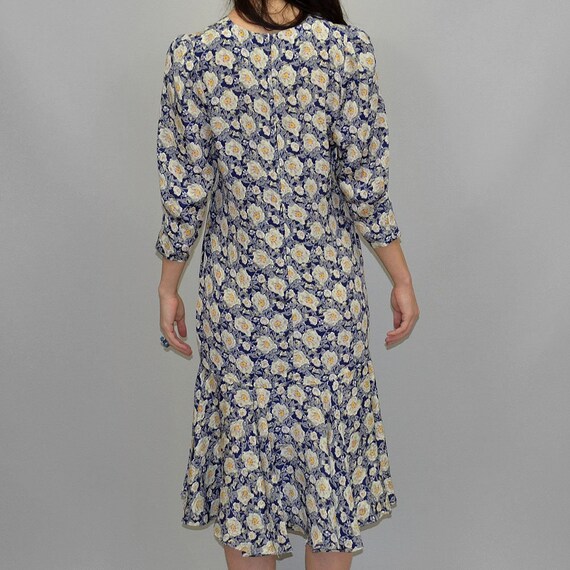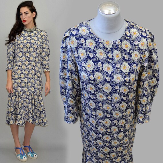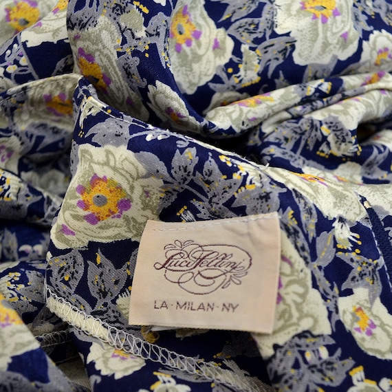 Vintage Luci SELLINI Italy Designer Peplum Flounce Tulip Dress Scarf Millefleurs Pattern Floral Granny Midi Robe Secretary 80s Airy Puffy M