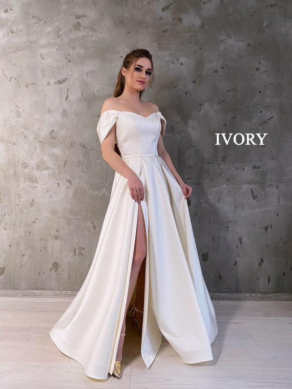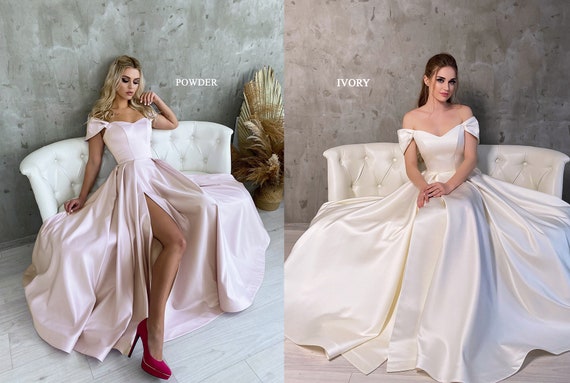 Yellow satin off shoulder corset prom dress with high slit. Custom formal bridesmaid wedding guest long dress. Color satin wedding dress.