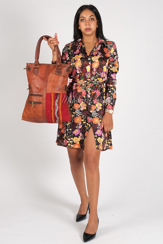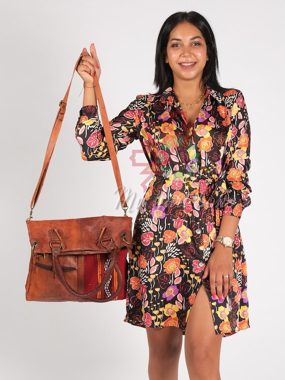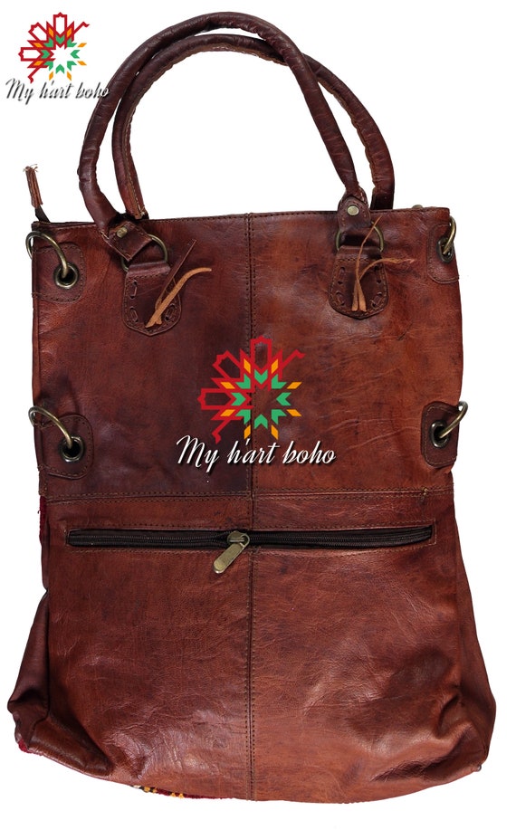 This Elegant Handmade Vintage Kilim Light Brown Leather Handbag is made with 100% genuine vegetable tanned goatskin and natural ingredients for color that lasts (chemical free). Versatile and looks good wherever you decide to take it! We have made this design and developed a range of natural leather handbags, which are beautiful handmade leather bags that can carry your laptop, iPad and other things safely, discreetly and in style. We offer medium size products, to accommodate laptop, iPad. We design and manufacture them by hand with exceptional quality in mind. This also allows 1 range pocket on the front, you can also have 1 pocket on the back. The antique nature of brown leather fits perfectly with the classic design of our satchels and handbags, making them easy to dress up or fold down. the beauty is that it looks too good to have laptop books and other things discreetly stored inside. Durable, lightweight and flexible while providing incredible strength and weather resistance. Pockets to keep your little things safe and provide perfect insulation between what you pack and other items. An optional shoulder strap can be adjusted to your preferred length with the size of (Height: 46cm, Width: 35cm, Very unique leather design which makes our m & in bag a special handmade piece of leather!