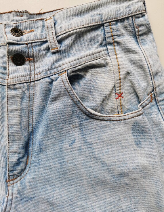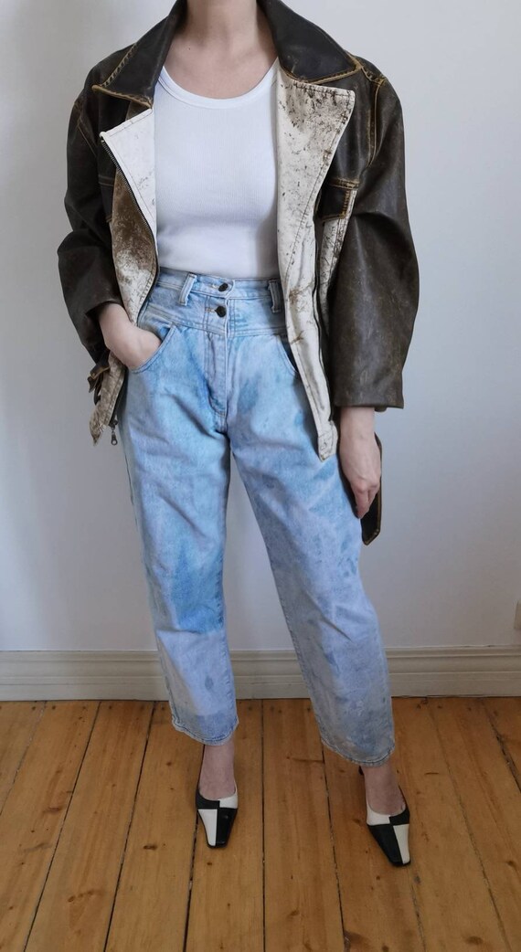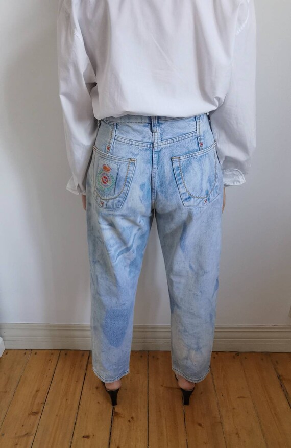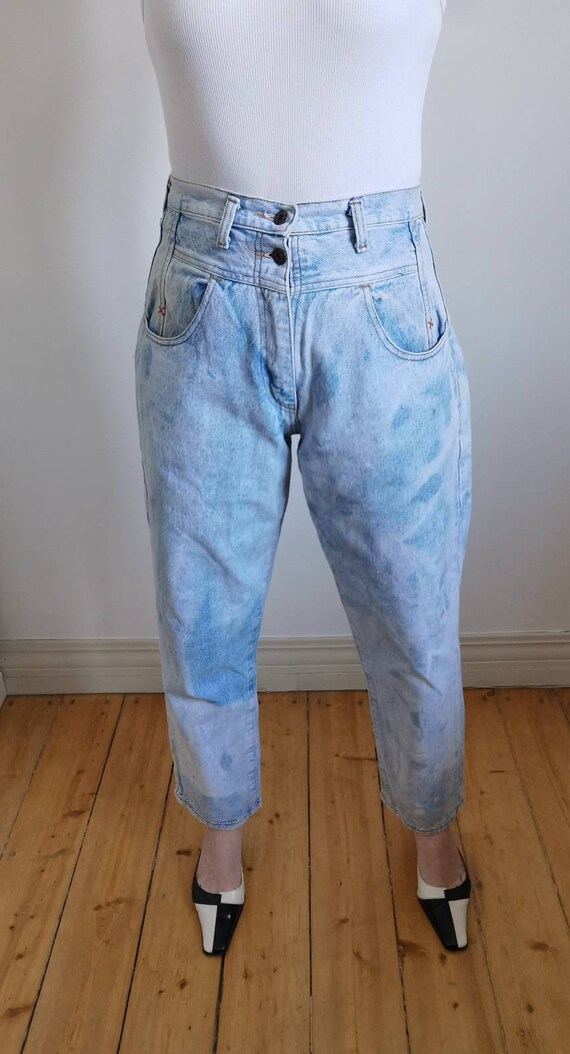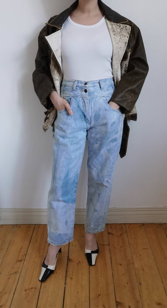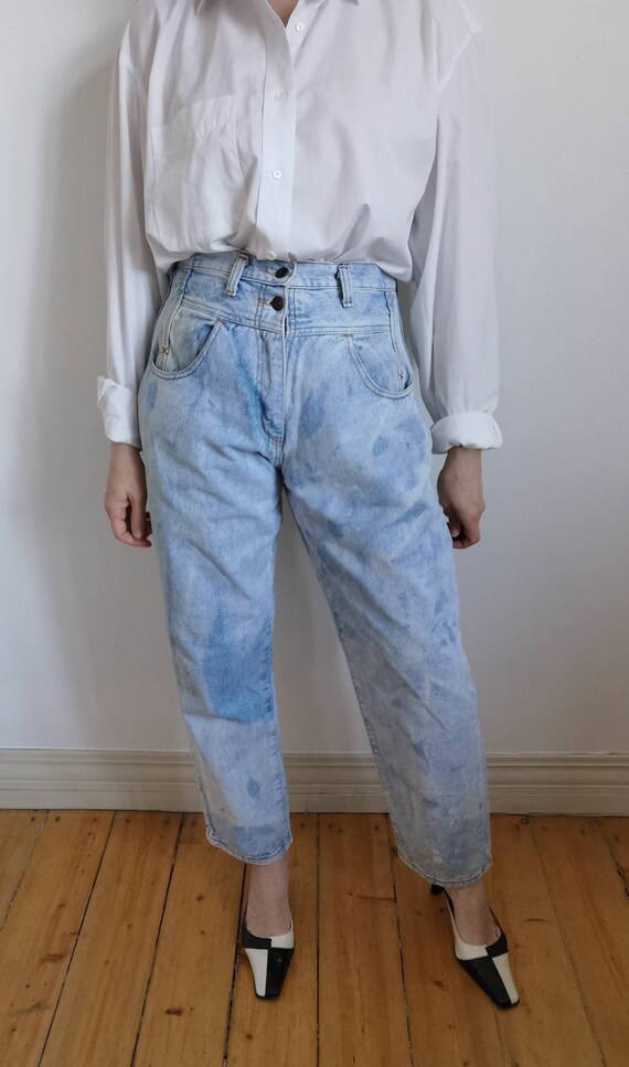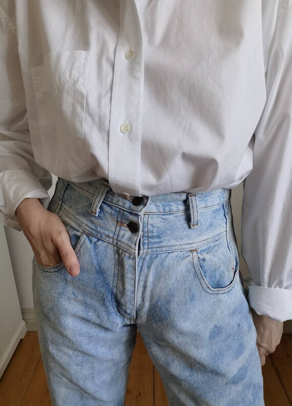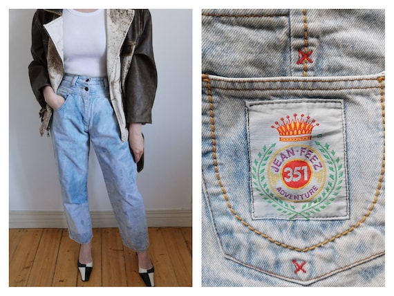 Vintage woman high waist Blue Jeans. 80s classic jeans. Closure type: zipp. Soft blue, asid denim jeans pockets. Wery comfortable woman jeans. Ideal for summer. Exelent vintage condition. 100% denim cotton The model is size S. Height 170. Jeans leight 102cm/40″ Hips 112cm/44″ Waist 74cm/29″ Rise 33cm/13″ Inseam 70cm/27,5″ Outseam 102cm/40″