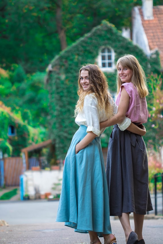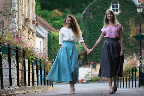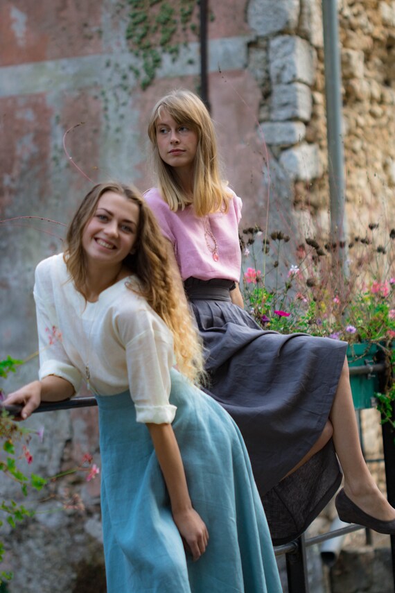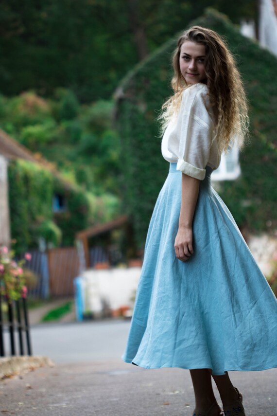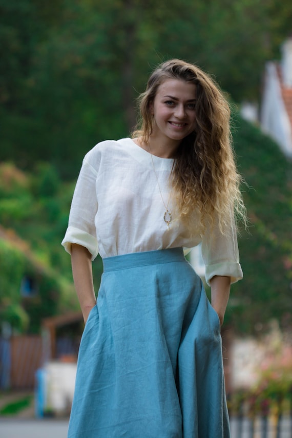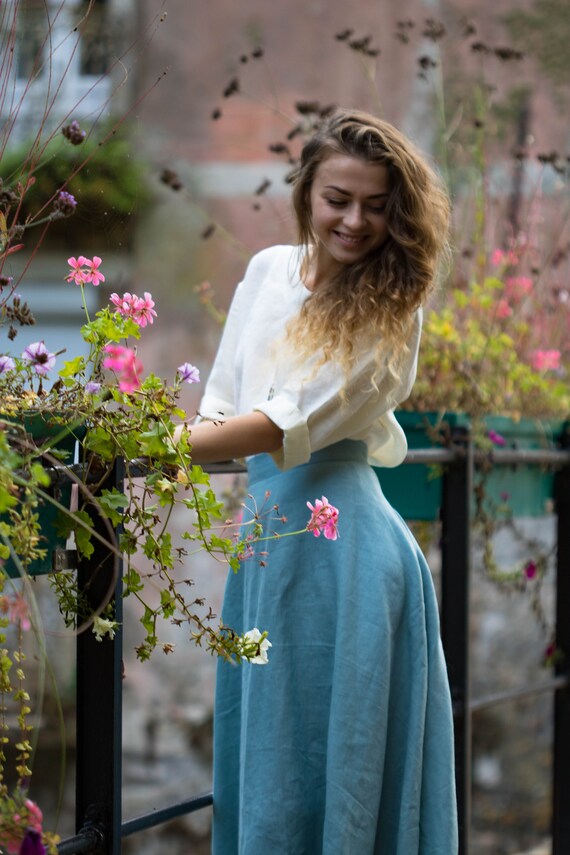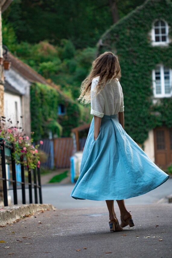Linen maxi skirt in sky bleu 100% bio linen and 100% handmade. Keep cool in summer, maintain warm in winter. Easy to wear everywhere and for all kind of body shape. Perfectly adapted with all-natural materials (cotton, wool, silk, cashmere, wood, stone) Goes perfect with all kind of shoes (sport, classic, casual) DESIGN FEATURES – Elegant high line – With pockets – mid calf style – 180 g /m2 SIZING S – 36 FR in centimeters / inches Chest circumference 84-88 cm/ 33 – 34,7’ Waist circumference 66-70cm/ 26 – 27,6’ Hip circumference 92-96 cm/ 36,3-37,8’ M – 38 FR in centimeters / inches Chest circumference 88-92 cm/ 34,7 -36,3’ Waist circumference 70-74cm / 27,6 – 29,2’ Hip circumference 96-100cm / 37,8 – 39,3’ Taille: L; 40FR Chest circumference 92-96 cm / 36,3 – 37,8’ Waist circumference 74-78 cm / 29,2 – 30,8’ Hip circumference 100-104 cm / 39,3’ – 41’ Taille: XL; 42FR Chest circumference 96-100 cm / 37, 8 – 39,3’ Waist circumference 78-82 cm / 30,8’ – 32,2’ Hip circumference 104-108 cm / 41 – 42,5’ The model on the photo wears size S, 165cm hight. PRODUCTION and DELIVERY Our philosophy – is slow fashion. Long living, high quality items that need time to be done. Mini collection which consist of one or two items in the chosen model. All Folie du Lin purchases come in an original, beautiful and at the same time organic packaging. Normally I need 3-5 days to send it to You. Depending on your location, your order will arrive approximately within: – USA & Canada: 7-20 days – New Zealand, Australia: 7-20 days – Europe: 3-10 days CARE of LINEN Care: Turn inside out before washing. Use warm hand wash or cold machine wash. Do not bleach, soak, rub, or tumble dry. More about care look on our website : https://foliedulin.com/conseils-dentretien-des-tissus-en-lin If you have any additional questions just write me, will be happy to help you ) If you were sensitive to the beauty of our work just look forward: https://www.etsy.com/fr/shop/FOLIEDULIN