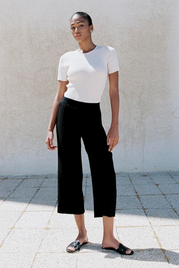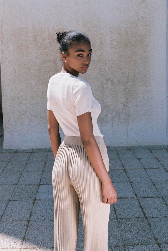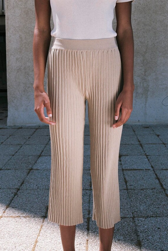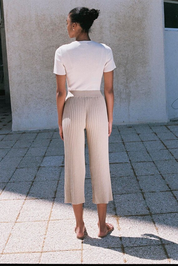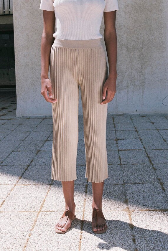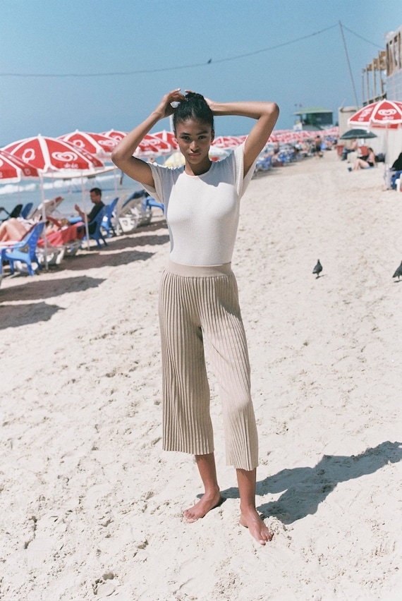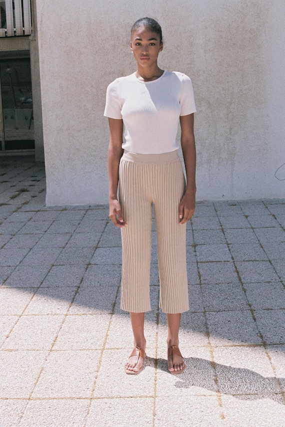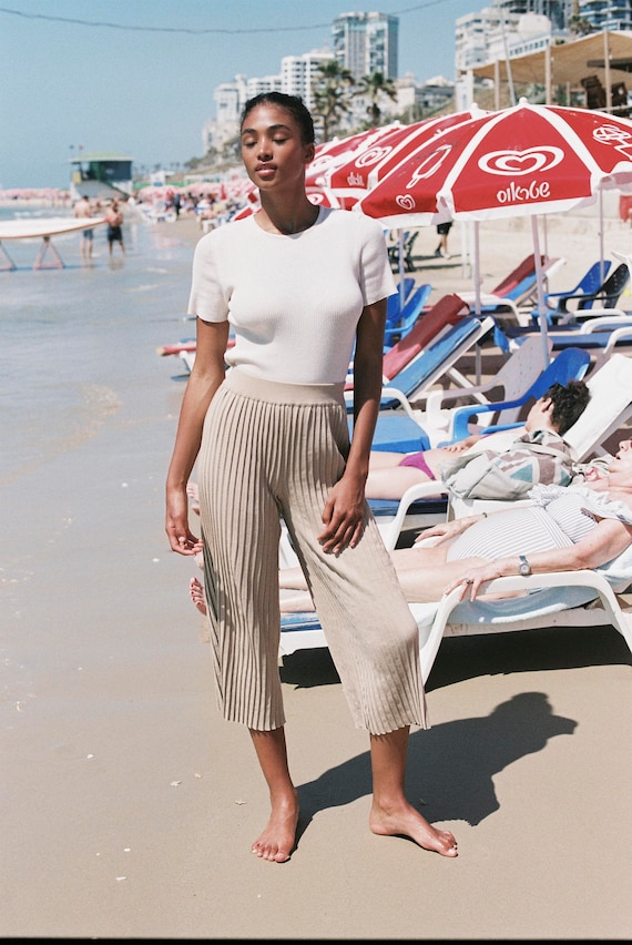 Beige Cotton Pleated Cropped Flare Accordion Trousers Pants, Women’s Minimalist Summer Clothing by Frett Knitwear —- 100% Makò Cotton Meet our beloved Pleated Pants in their lightweight Warmer Weather version, reimagined for warmer days. Knitted on a finer gauge machine from the softest Makò cotton and effortless to wear dressed up or down, for statement dressing or lounging at home – you won’t want to take them off. The pants feature a wide leg and a comfortable elastic waist. Pair them with a timeless basic, such as the Ribbed Makò T. Makò Cotton: the finest, smoothest and strongest cotton in the world. Produced in upper Egypt, Makò cotton is spun from long-staple fibers to develop a very fine, premium-quality cotton. Naturally non-allergenic, the fiber’s unique structure creates a soft, absorbent, and breathable fabric, making it the perfect choice for the clothing worn close to the skin. Rebecca is 178cm/5’10” tall and wears size S/M. — You may also like my other Pants & Legging >> https://www.etsy.com/il-en/shop/FrettKnitwear?section=30234723 Back to my shop >> https://www.etsy.com/shop/FrettKnitwear